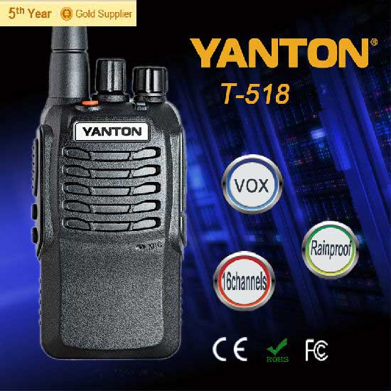 Displayed is a walkie talkie that features 16 channels. With an output power of 5W, this walkie talkie is programmable for your convenience. This high quality walkie talkie also comes with either Chinese or English prompt.