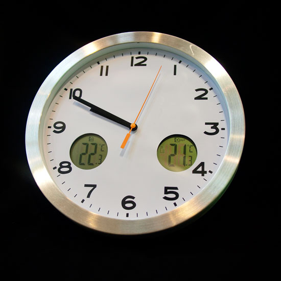This simplistic round wall clock features a white dial with black markers and hands. It comes with two digital displays that indicate indoor and outdoor temperatures. The metallic rim of the clock lends a touch of modern charm to it.