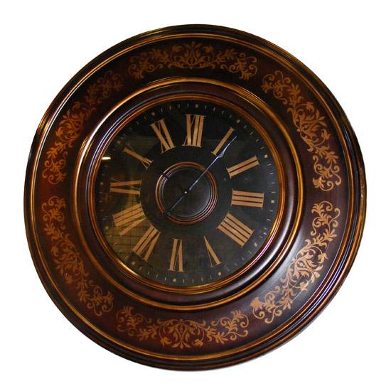 This is a wall clock with an iron frame. The round shape wall clock has a diameter of 110cm. The clock dial with a glass cover displays Roman numerals.