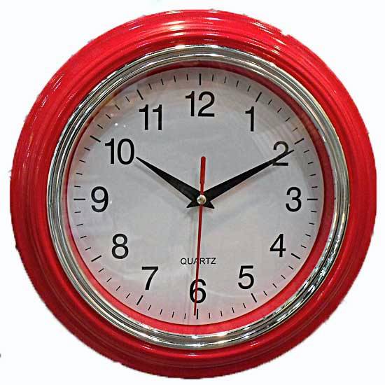 This clock features a round plastic case with red plating and a silvery ring. The simple face with Roman numerals offers a timeless appearance. The prominent hands ensure accurate time reading.