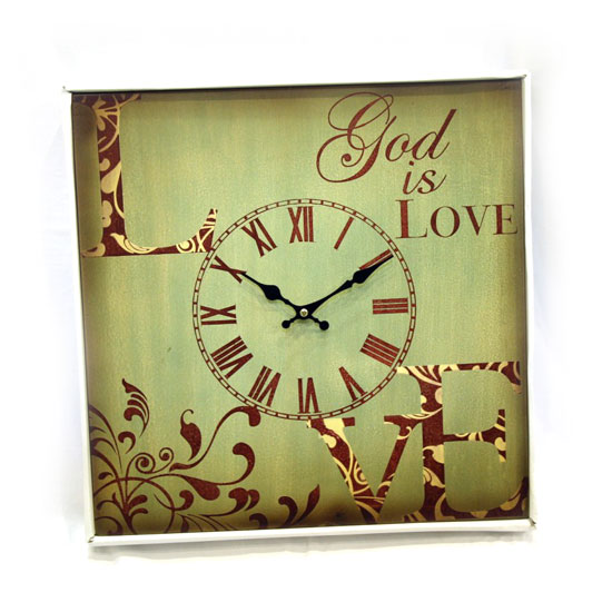 The wall clock is constructed with wood for a durable quality. It indicates time with antique-style Roman time markers. This clock is also ornamented with elegant swirly patterns and text.
