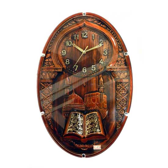 This vintage-style wall clock features an oval-shaped casing accented with beautiful embossed mosque motifs. Made of quality PP material, the wall clock showcases a glossy walnut finish. The dial is designed with three watch hands and Arabic numeral hour markers.