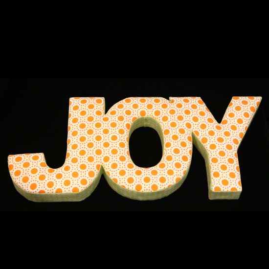 The wall decoration features the 3D fabric word "JOY". The panel is decorated with circles and dot patterns. It boasts a vivid color tone which catches everybody's' attention.