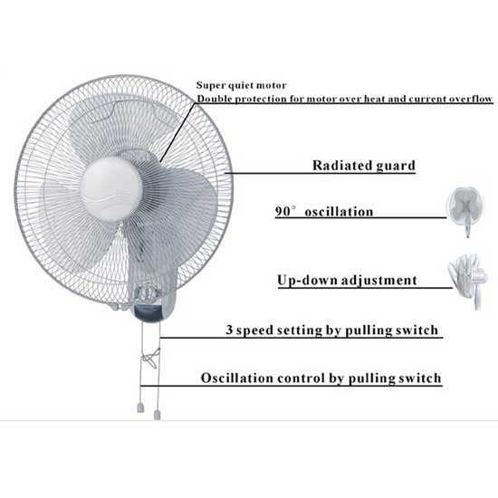 This advanced electric wall fan is equipped with a super quiet motor, ensuring minimal disruption during its operation. Features include 90-degree oscillation, a 3-speed setting, up-down adjustment, as well as built-in motor overheat and current overflow protection. The pulling switch is used to control oscillation and adjust the speed settings.
