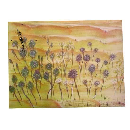 This is a wall clock that merges perfectly with a beautiful painting. On the back of painting is a tool box for pens and with 4 key hooks. The painting can be mounted on the wall to lift the interior decor.