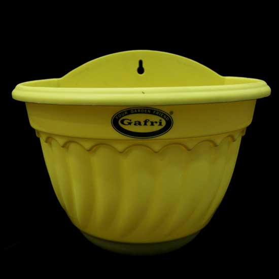 Featured is a flower pot coming in yellow. The body comes with curvy ribs to show an elegant style. The wall-mounted style is especially suitable for hanging plants.