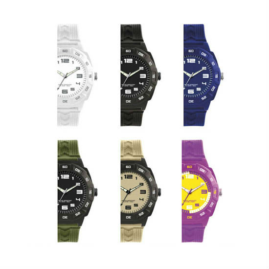Plastic case, silicone strap.