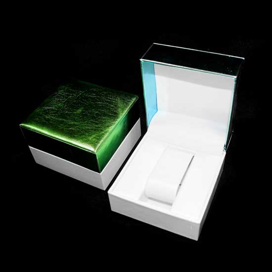 This two-toned watch box features a glossy green lid and a white body. The reliable watch box protects your precious timepiece from bumps and scratches. The durable watch box can serve you for years.