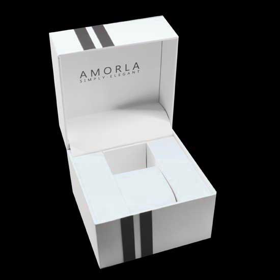 This stylish watch box features black stripes on the white surface. The well-constructed paper box protects your watches from bumps, scratches, dust and other types of damage. It is finely manufactured for a long lifespan.