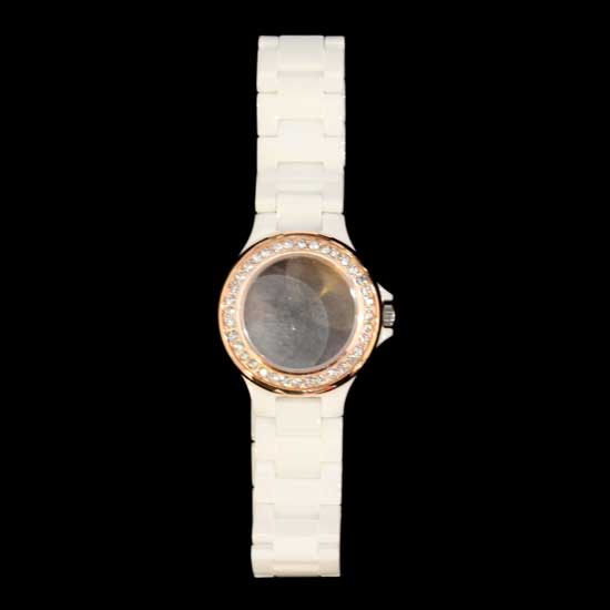 This is a stylish watch case that boasts allover shimmering stones for a decorative touch. It is skillfully crafted to showcase a neat and clean appearance. The rose-golden tone highlights this fashionable watch case.