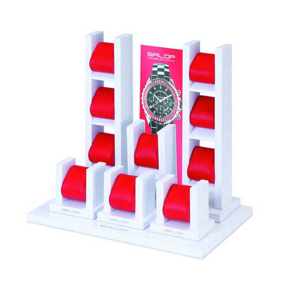 This is a watch display stand that comes with hues of red and white for an elegant look. The soft cushioned pads are designed to give full protection to different types of timepieces. The simple yet streamlined design makes it ideal for decorating any shop.