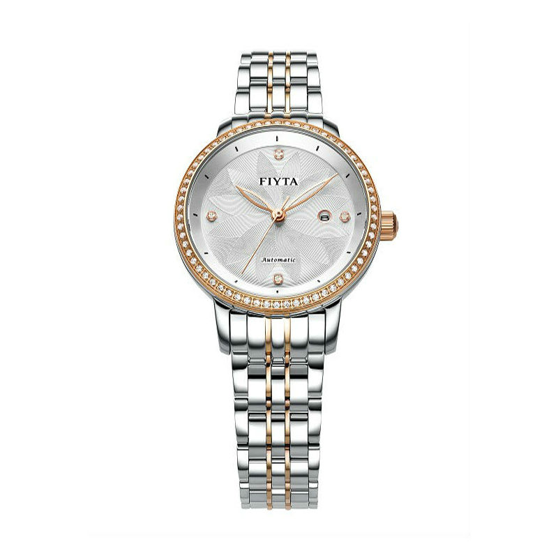 This ladies watch has a round watch case and comes with a stainless steel bracelet. It is adorned with a flower on the dial and is set with gemstones on the bezel. Equipped with an automatic movement, this watch offers reliable and precise time keeping.