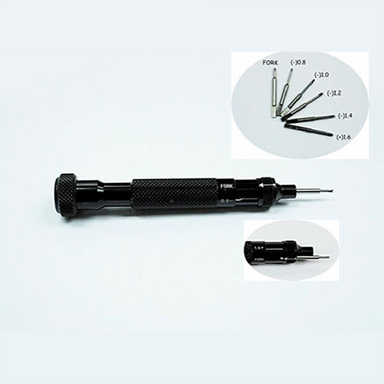 Displayed here is a 6 in 1 screwdriver for watch repair. This screwdriver is made of strong replacement reversible straight blades for screwdrivers in 6 sizes stored in the handle. It is equipped with an adjustable clamp.
