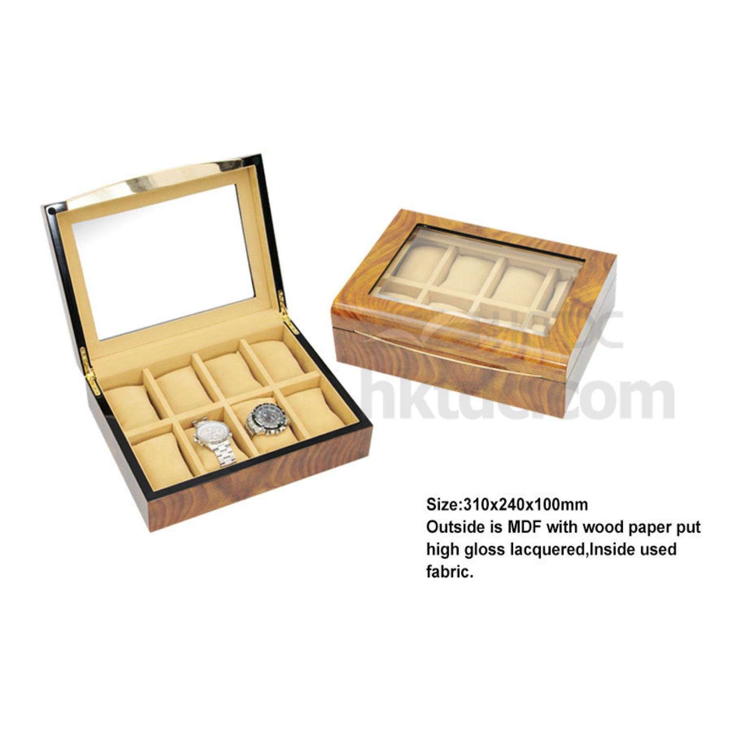This watch storage box sports a rectangular silhouette crafted with sturdy wood construction. It features a see-through viewing window to display your watch collection beautifully while keeping it safe and organized. Built with an ample interior, this watch storage box houses up to eight watches of varying sizes.