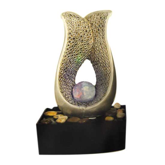 This water fountain is artistic in style. The unique design boasts a U-shaped container with circular holes, holding a ball at its base. The square base holds water and embellishment stones.