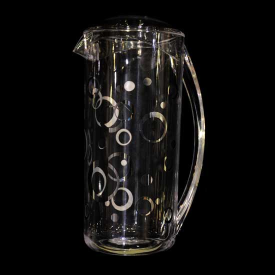 Displayed here is a cylindrical water pitcher with a transparent exterior. The ring and dot patterns lend extra style to the appearance. The top is designed with a tight-fitting lid to keep the water away from dirt.