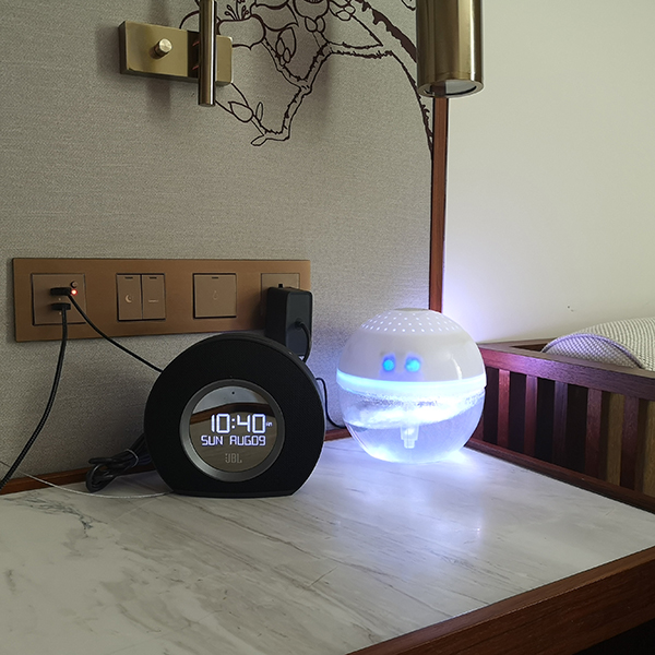 The high-speed rotating impeller accelerates the air flow. The water mist and negative oxygen ions produced by the water droplets hitting the water tank wall spread rapidly in the air and spread all over the whole room with the air flow.