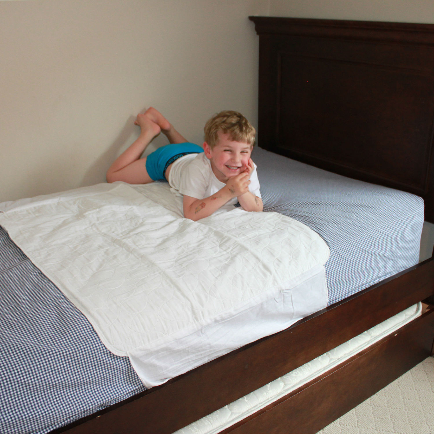 Baby Works Waterproof Mattress and Sheet Protector will protect your childs mattress and keep bed sheets dry throughout toilet training. No more middle of the night sheet stripping. It is 100 percent waterproof with a non slip backing that fits under or over bed sheets to protect mattresses from moisture and staining. The soft quilted poly cotton surface comes with tuck in flaps for a snug and comfy fit on any size mattress. It is highly absorbent bleach-able machine washable and dryer safe too.