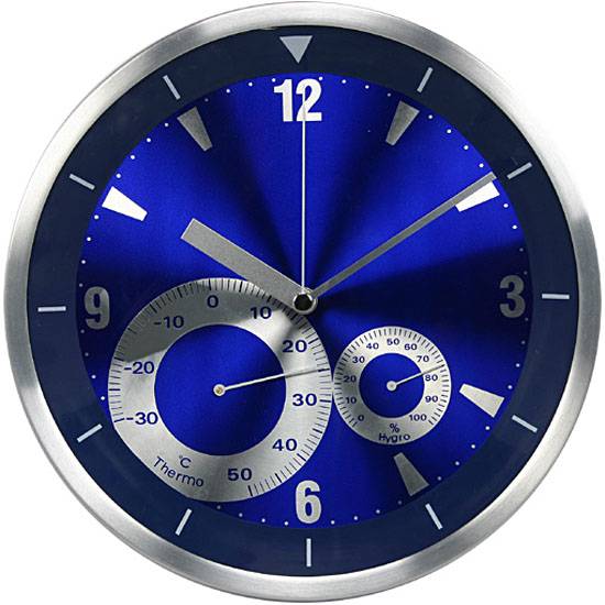The weather station clock goes with 2 versatile subdials for displaying of thermometer and hygrometer. The metallic blue dial makes an excellent complement to the silvery hour indexes, hands and case. Highlight your home decor and keep on time with a fine wall clock.