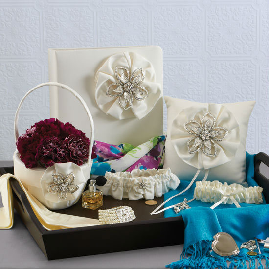 • Includes guest book, memory book, signing pen, flower girl basket, ring bearer pillow, bridal garter and "toss" garter, crystal handle knife and server set, unity candle, and toasting glasses.