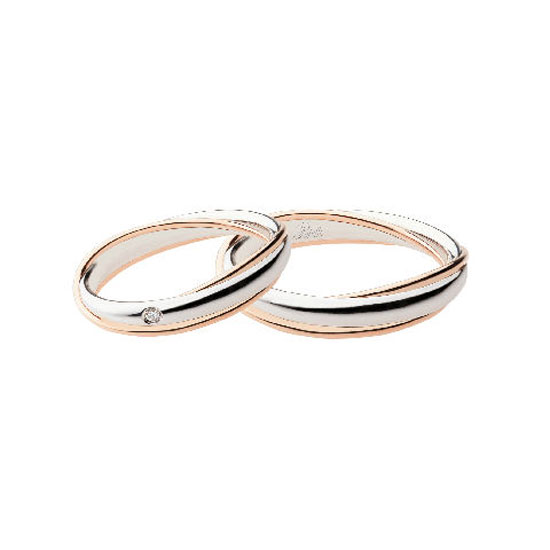 This is a pair of modern wedding bands with a highly-glossy finish. The female band is finely crafted with a diamond for an elegant touch. All wedding bands are completely handcrafted in our factory.