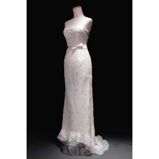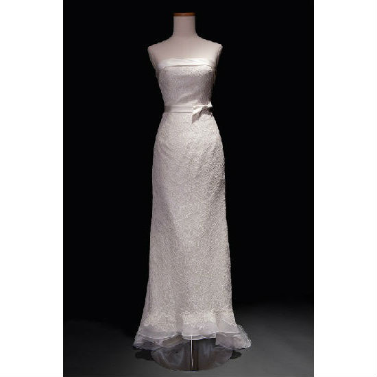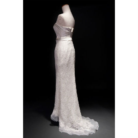 This wedding gown use an elegant white to create a simple design that is stunning in its appeal. Overlaid with intricate lace, it shows off a fitted, streamlined shape that flares to an A-line skirt below the knee. Sophisticated and beautifully crafted, it will surely make your wedding day a day to remember.