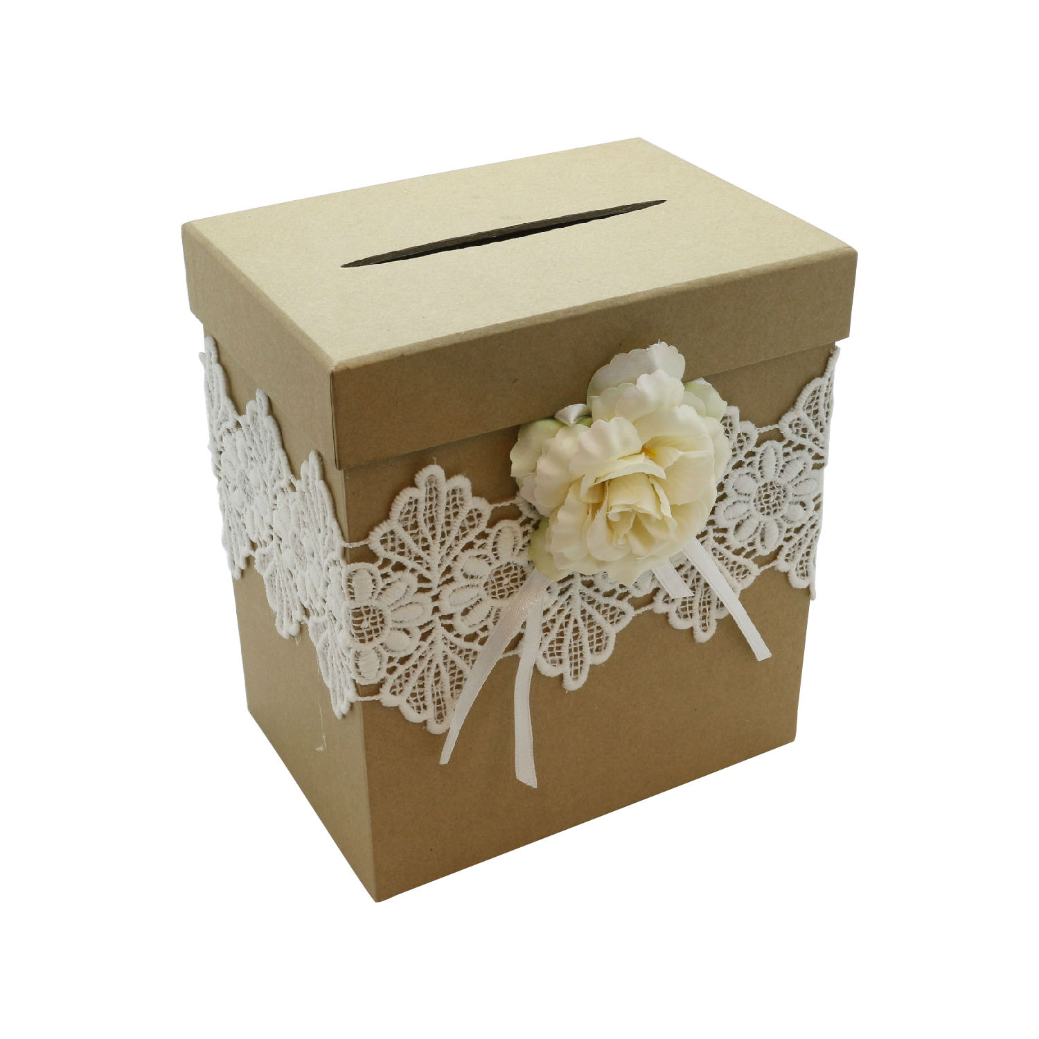 A perfect accessory to keep all gift cards and monetary gifts at the wedding reception, this cardboard box is sturdy and has a slim oval slot that fits most envelopes. This holder flaunts a natural brown shade, sporting classy elegance with a guipure lace tape wrapped around and a flower accented.