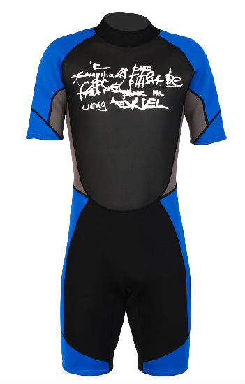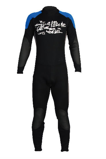 This is a set of eye-catching wet suit for swimming and water sports. The swimming wear is made of neoprene/nylon jersey so it fits well to the body. It can avoid sunburn by shielding sunlight, and keeps body warm in cold water.