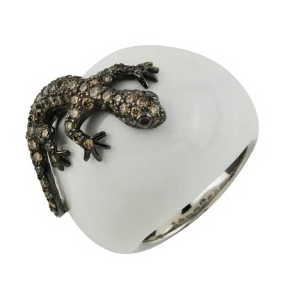 The little lizard is the only adornment for this dome white agate ring. The lizard is paved with brown diamonds, creating a contrast with the pure white agate. The ring is a fun and stylish accessory for women’s hand.