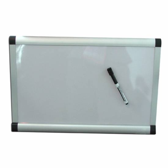 A magnetic dry erase board with an aluminum frame. The rectangular white board can be wall mounted. It comes with a black coloured mark pen.