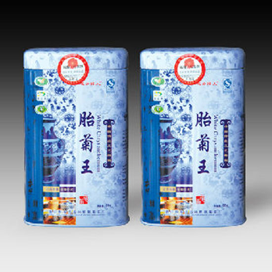 Showcased is a can of white chrysanthemum tea. It boasts a unique, freshening flavor and taste that delight many drinkers. This tasty and healthy tea is an ideal choice addition to your home or office.