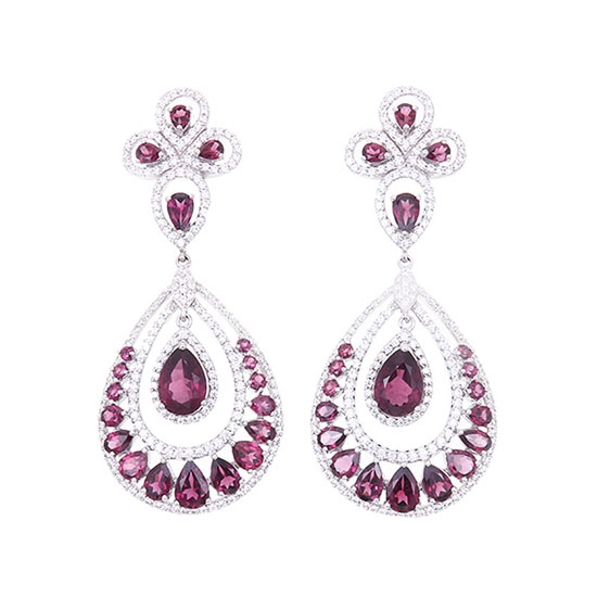 These white gold earrings feature a pear-shaped and multi-layered design. The pear-cut rhodolites are embellished with the finest diamonds. They are exquisitely made with attention to details.