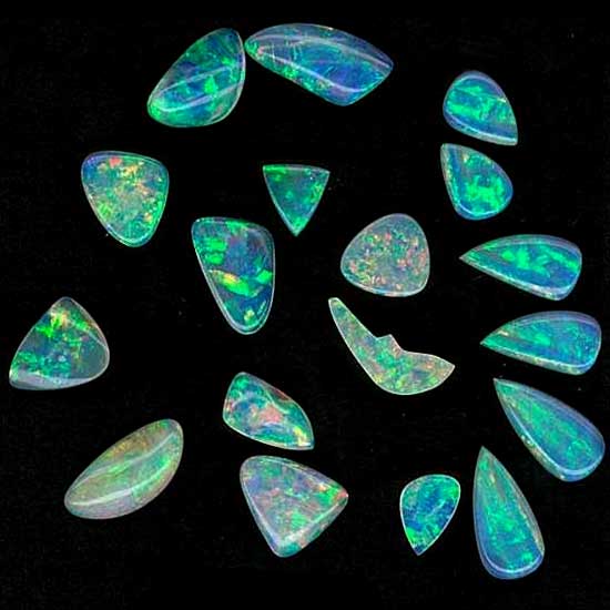 This collection of white opal stones comes in different slender shapes with an angular silhouette. The stone unleashes green aquatic shine with a fluorescent quality. Treat yourself to the color therapy of the elegant white opal.