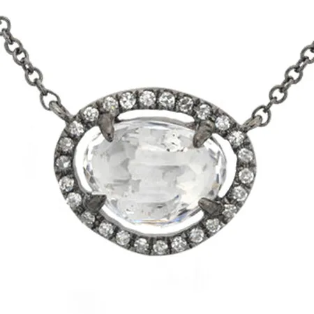 The necklace is accented by a huge white topaz with a crystal-clear appearance. It is constructed of 14k white gold for luxuriousness. The necklace is also completed with a black rhodium finish to achieve enhanced appeal.