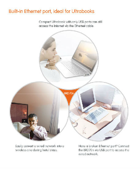 The BRD70n is an excellent choice for surfing the Internet on-the-go. Along with functioning as a three-in-one wireless network adapter, wired router, and wireless router, it can also be configured as an Access Point and Wireless Access Point to provide Internet access in almost any situation. The BRD70n also features an exclusive Smart Wi-Fi that allows you to control your connected devices and manage your network from anywhere and anytime.