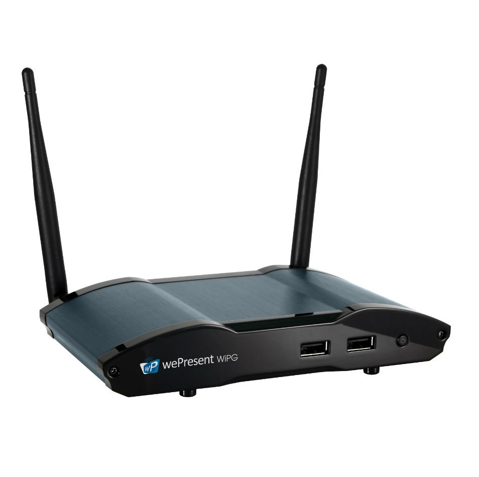 The wePresent WiPG-2000 wireless presentation system has advanced features like iOS mirroring, an onboard USB media and document player, a streaming-video player, and 1-to-4 network video distribution capabilities.