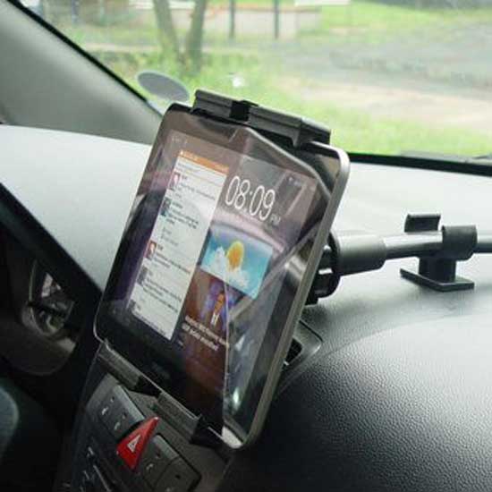This windshield mount features an extra-large diameter 109mm suction cup that ensures super strong holding onto the windshield. The "U" holding base fixed on the dashboard stabilizes the long flexible holding arm. It comes with a powerful VH-703B tablet holder that adjusts to fit full range tablets.