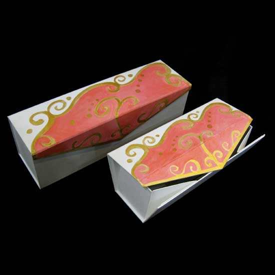 The wine box comes in a long cuboid shape with an ample capacity. It is constructed of gray cardboard and covered with leather paper. This box is also crafted with appealing swirly patterns.