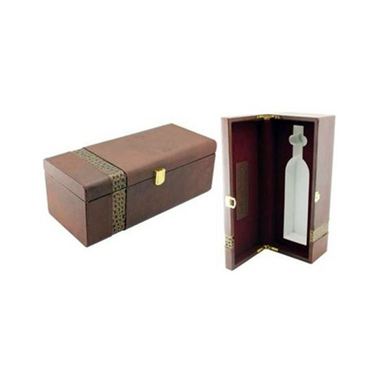 This is a wine box made of high-quality leather. It features a classic and retro appearance in dark red. The golden embellishment and lock add a touch of elegance to this design.