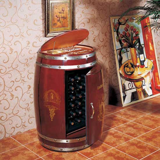 Outlined is a wine cooling cabinet with the special appearance of an oak barrel that is visually appealing. The robust wood and steel construction is capable of holding 18 wine bottles. This stylish and potent wine cabinet is a good choice to store vintage bottles.
