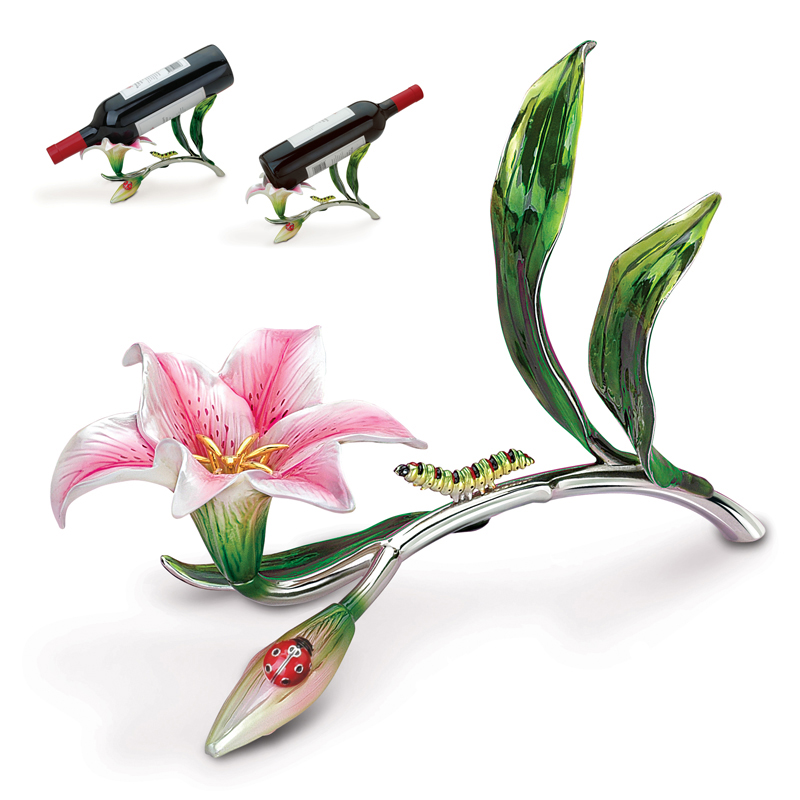 This delicately crafted wine holder depicts a blooming pink lily with a ladybird and a caterpillar. It features fine details and showcases elegance of nature. Update your bar accessories with this artistic wine holder.