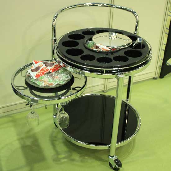 This sophisticated wine trolley can hold up to 12 bottles of wine. It is equipped with strong and durable hooks for holding wine glasses. Featuring a sturdy construction and 3 smooth-gliding, swivel caster wheels, this stylish wine trolley is a great choice for serving drinks to your customers.
