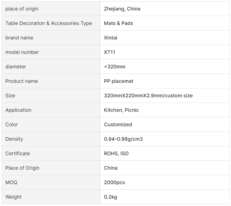 Wipe-Clean PP Placemat Reversible PP Plastic Table Mat Printed Dining Table Mat with Customized Design