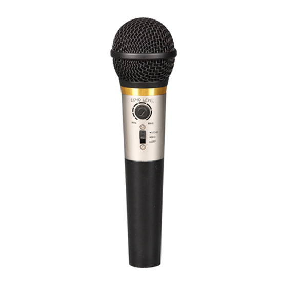 Photographed is a microphone with a sophisticated wired design. The microphone features a metal housing for enhanced durability. The echo level is easily adjustable with the knob button.