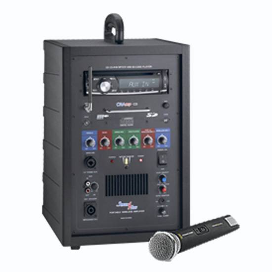 This portable wireless amplifier features an anti-shock CD, USB and SD card player with LCD backlight display. It plays the standard MP3 format and CD discs. It includes a powerful 50-watt amplifier with a wired and wireless microphone system. This is a complete and all-in-one wireless PA system offers professional crystal-clear acoustic sound and wireless transmission.