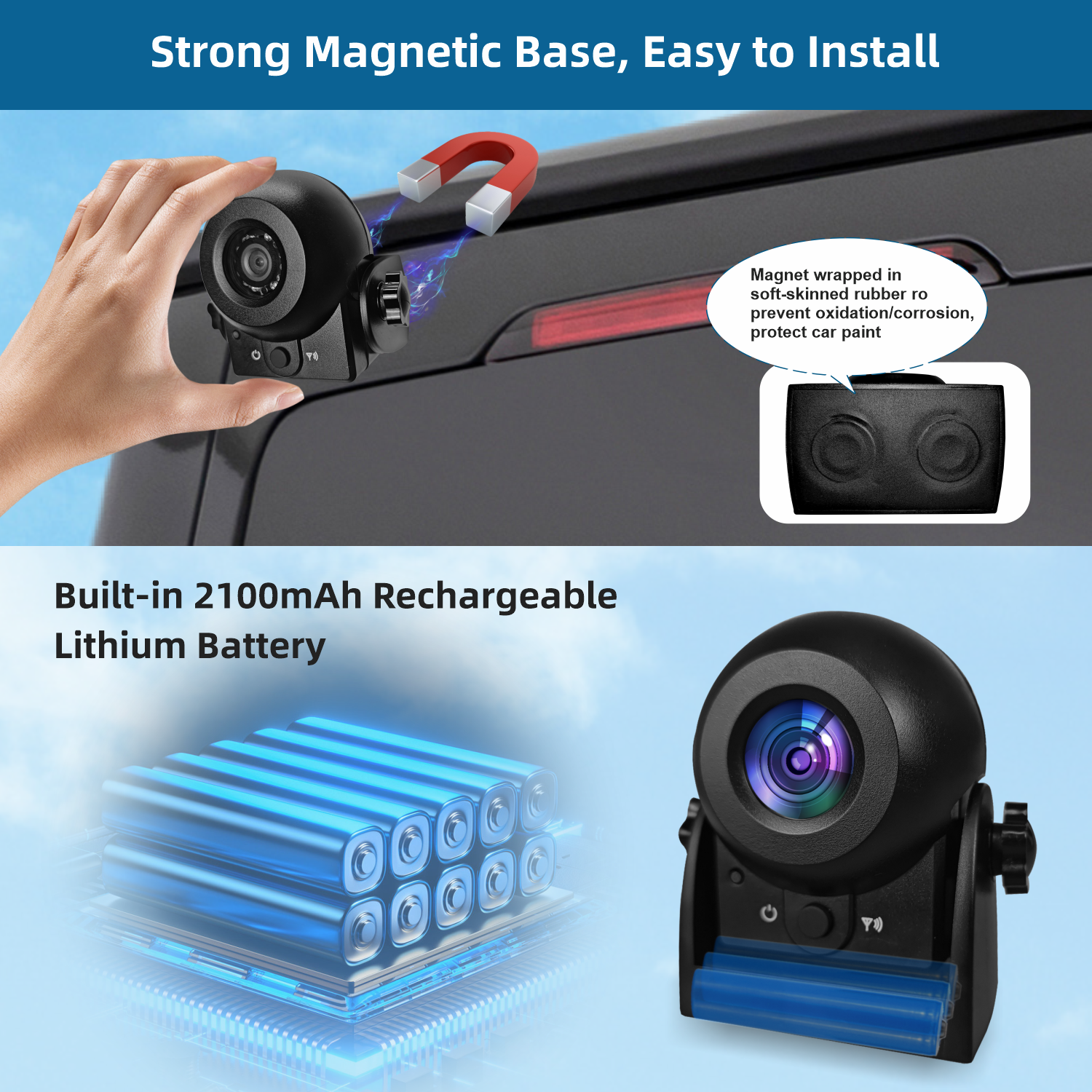 Wireless Backup Camera with APP, Night Vision,IP68 Waterproof, Rechargeable Battery,Strong Magnetic Base,Support IOS and Android Phones;