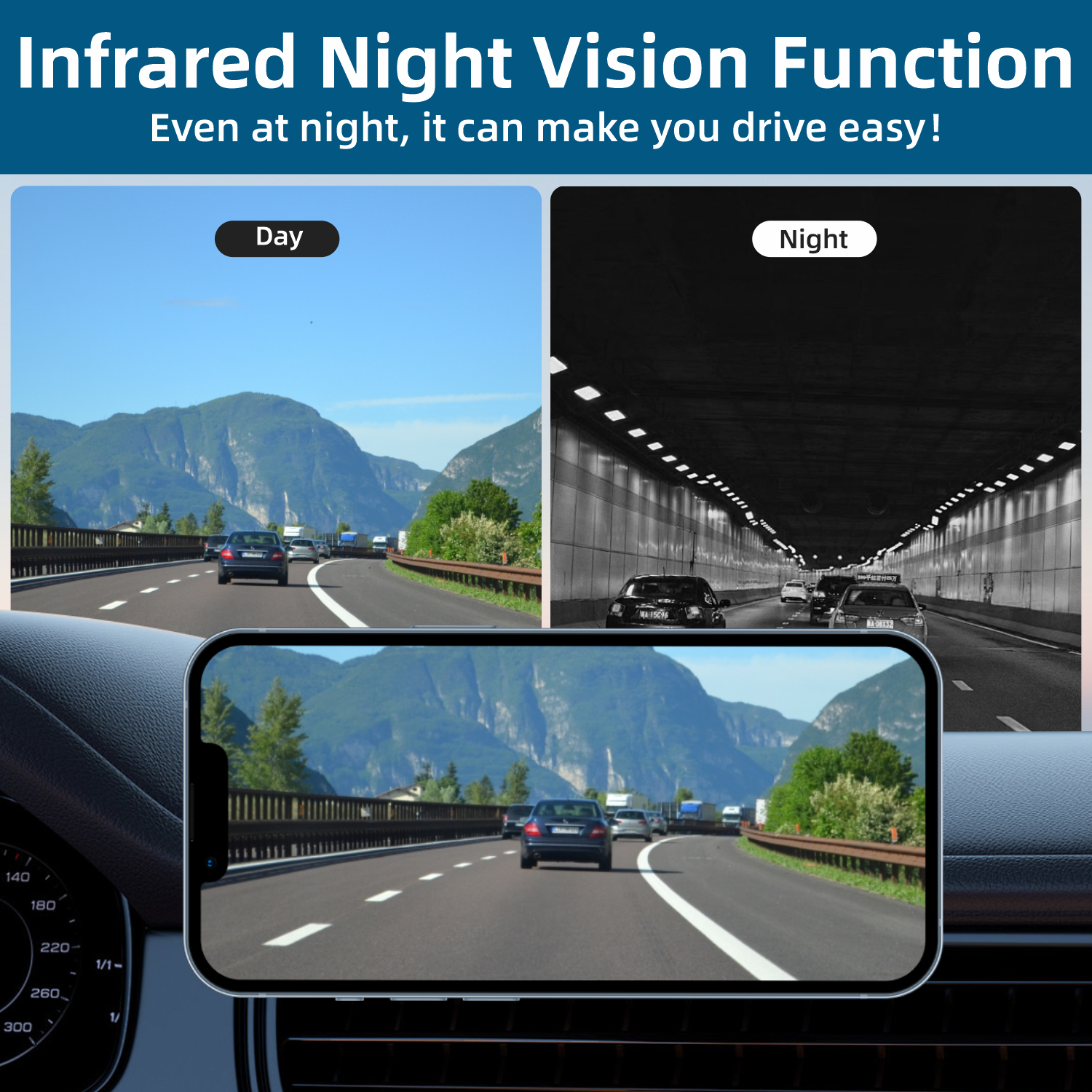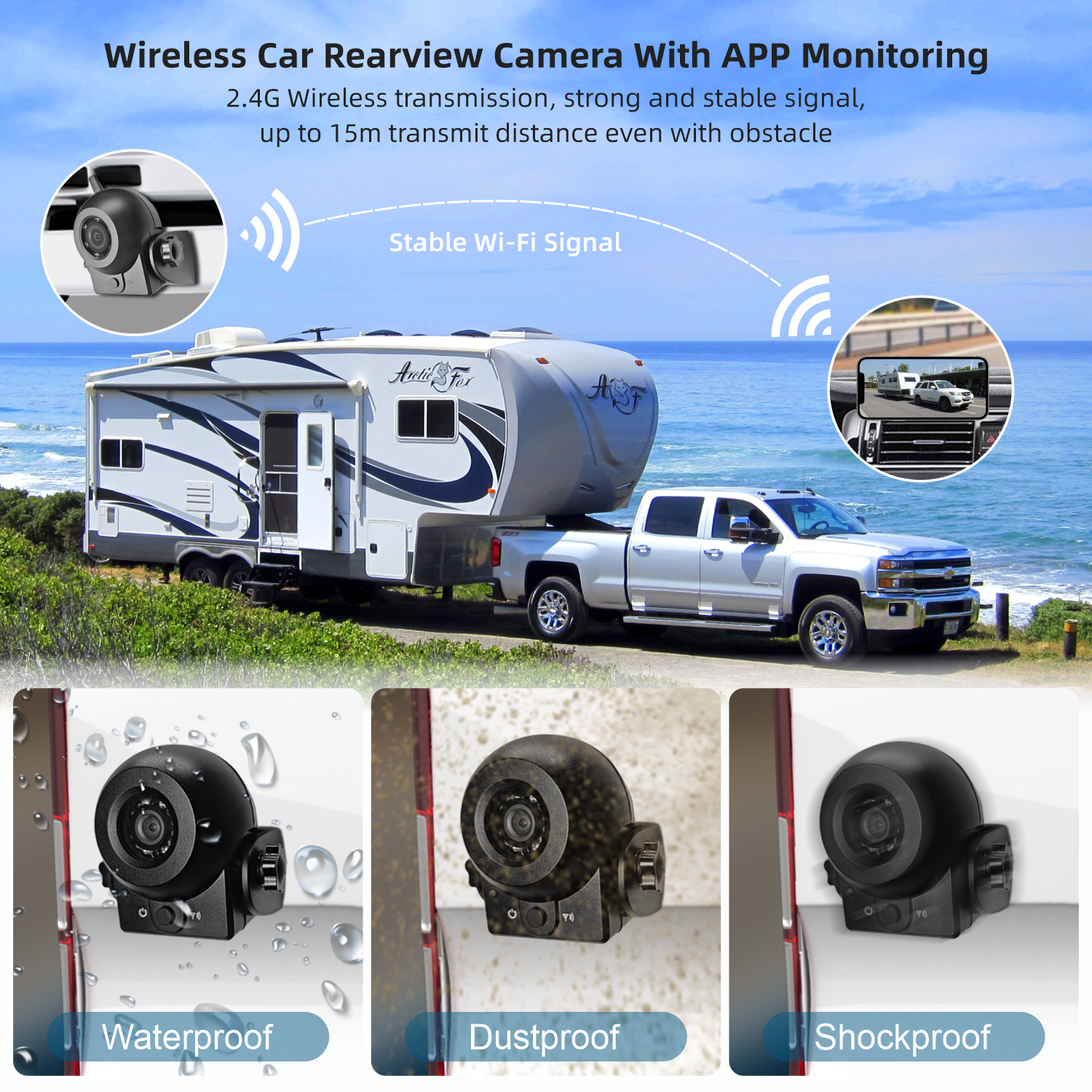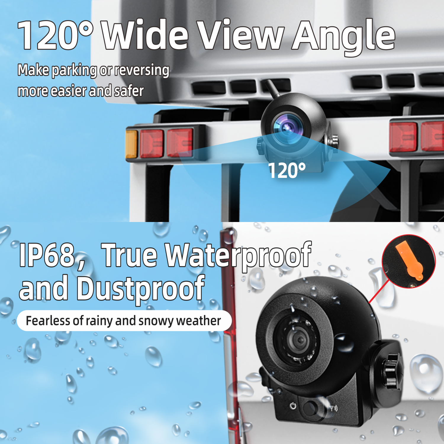 4. This wireless backup camera also has infrared night vision function, allowing you to drive safely at night. The whole machine is designed to be waterproof, with an IP68 waterproof rating, so you can use it with confidence whether it rains or snows.