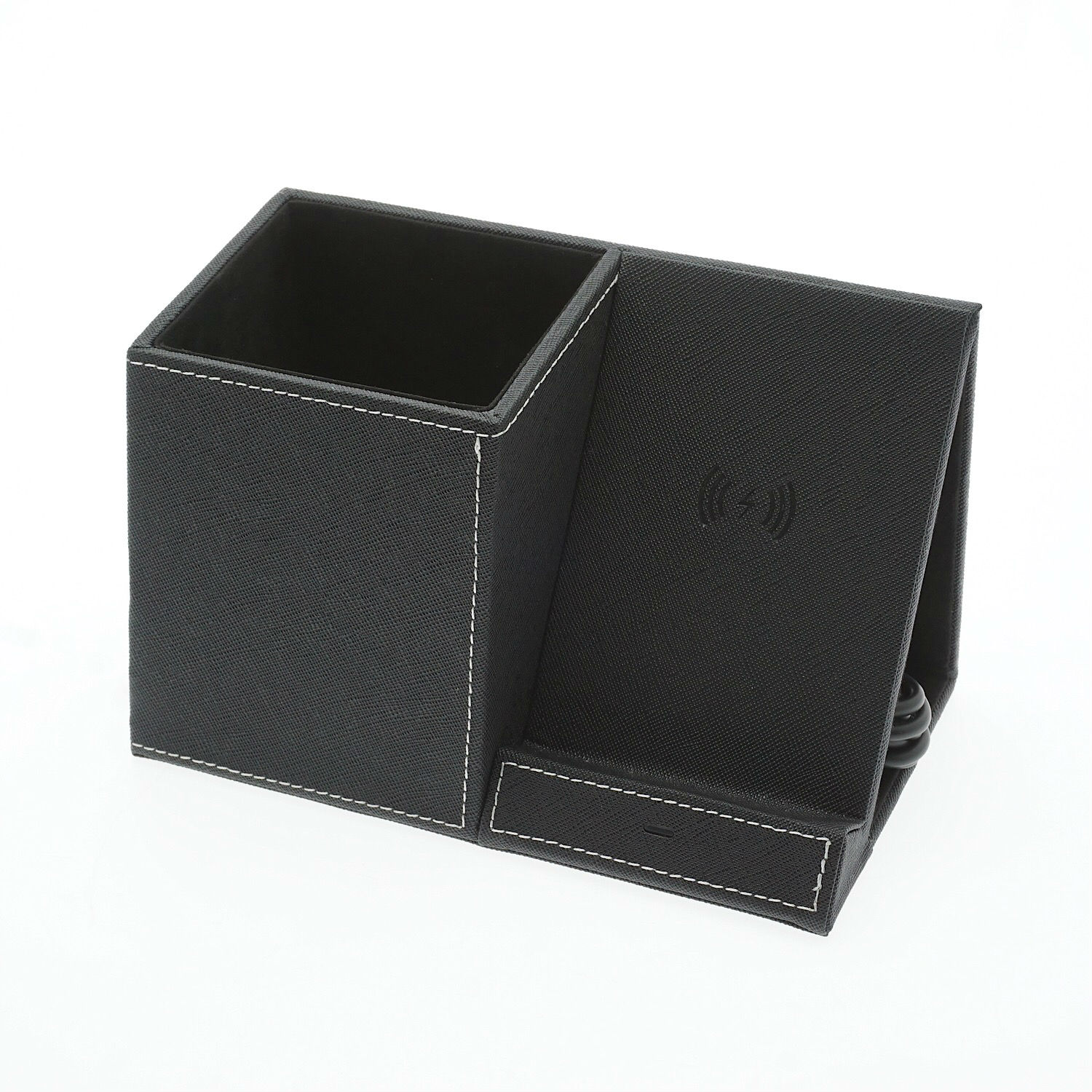This wireless charging stand is made of PU and is combined with a pen holder on the side. It comes in an angled design and offers a comfortable viewing angle for watching videos. The wireless charging stand can help keep stationery organized and is a functional addition to your desktop.