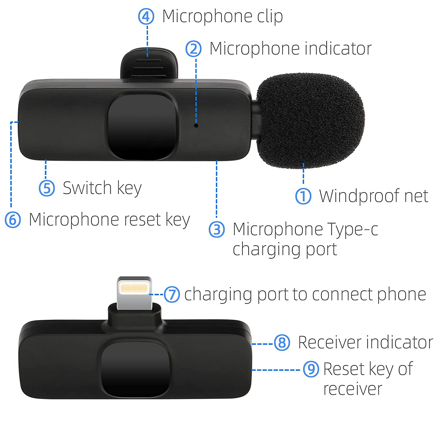 The upgraded wireless clip-on microphone comes with an illuminated connector and charging cable. Compatible with iOS smartphones, iPads, and more, the handheld microphone is suitable for interviews, online meetings, podcasts, vlogs, live broadcasts
