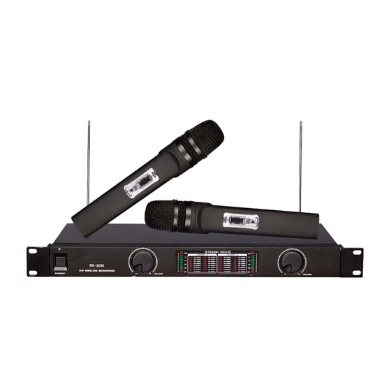 Displayed here is a wireless microphone with two antennas for better receiving ability. The simple and clear control is designed for easy operation. This wireless microphone system is appointed to enhance your home theater.